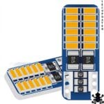 This is a pair of amber T10 W5W LED bulbs using the 3014 chip in a 24-SMD flat configuration. The bulb dimensions are identical to a standard halogen T10, making it a direct physical replacement in any socket that accepts a T10 or T15 bulb. Built-in resistors make these compatible with Canbus-equipped vehicles without triggering bulb failure warnings on the dashboard in most applications.