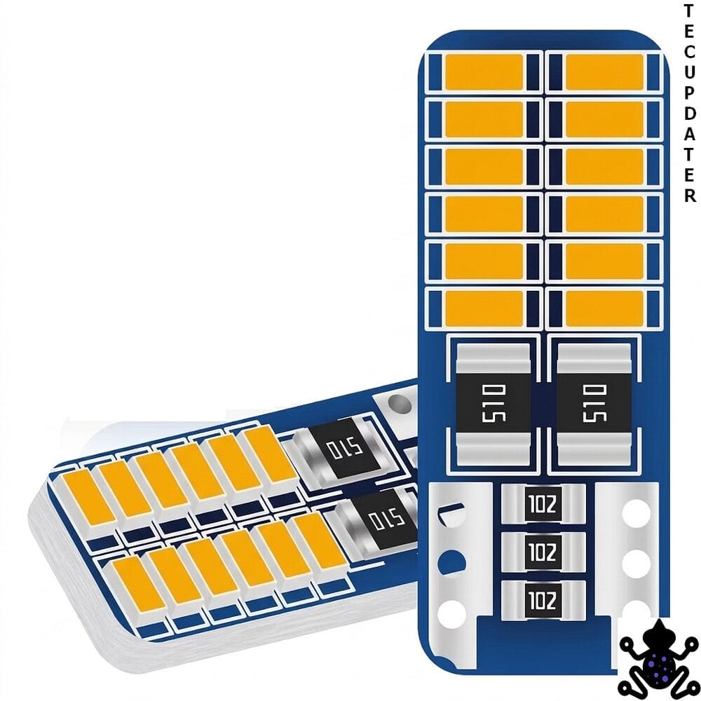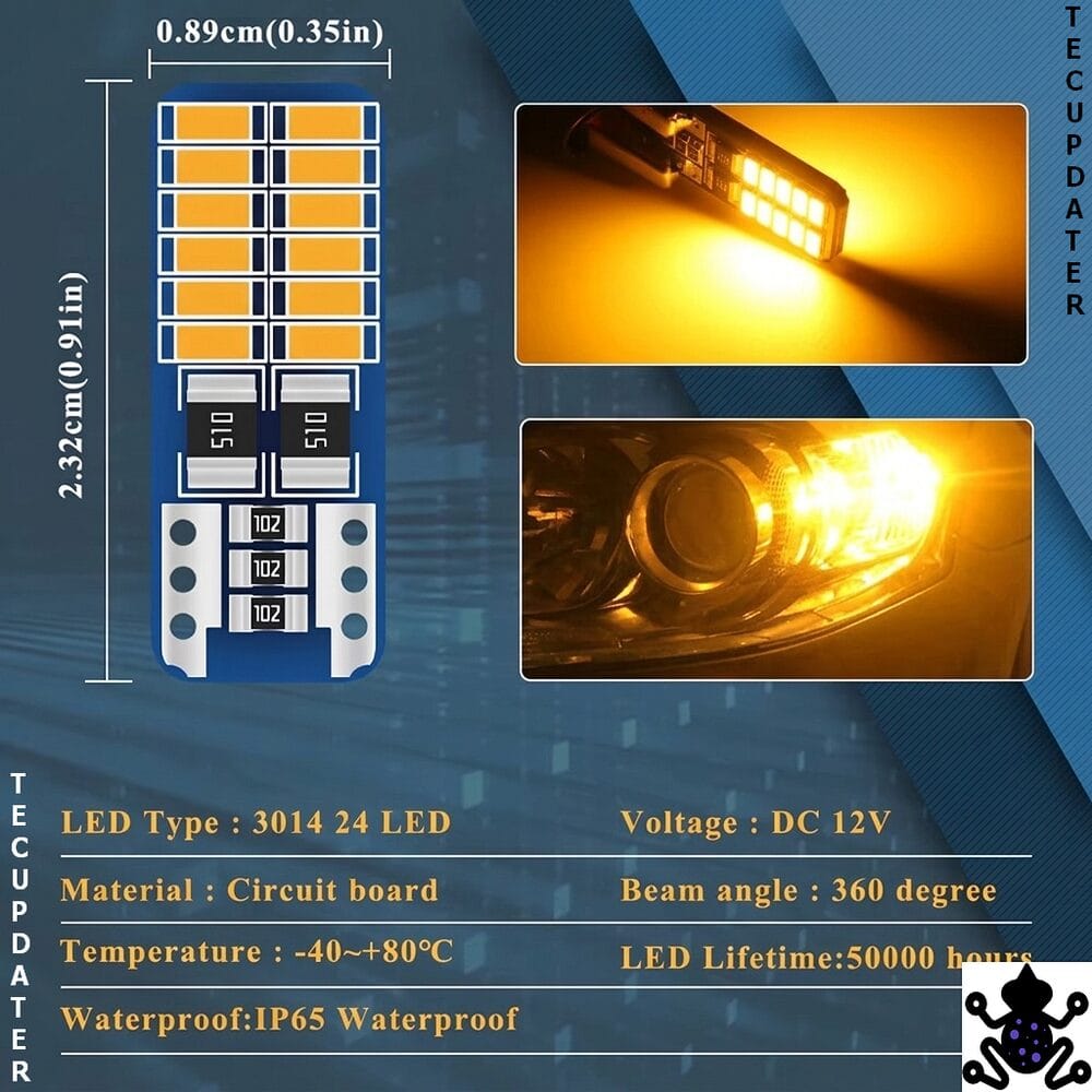This is a pair of amber T10 W5W LED bulbs using the 3014 chip in a 24-SMD flat configuration. The bulb dimensions are identical to a standard halogen T10, making it a direct physical replacement in any socket that accepts a T10 or T15 bulb. Built-in resistors make these compatible with Canbus-equipped vehicles without triggering bulb failure warnings on the dashboard in most applications.